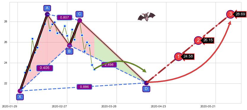 ➣ 未完成【蝙蝠】形态起点X: 2020-01-30, 已到达C点: 2020-03-05, 预测最终D点: 2020-04-13, 共52交易日