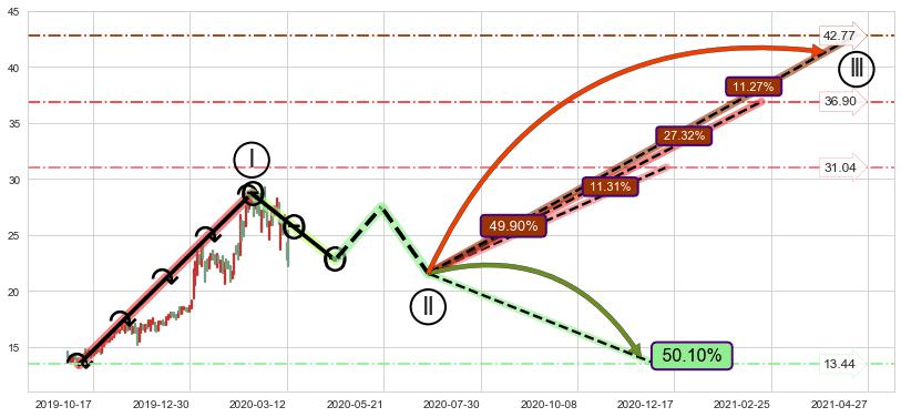 ➣ AI预测: 假定反转启动后, 第❶目标位置(2020-04-30, 24.58)