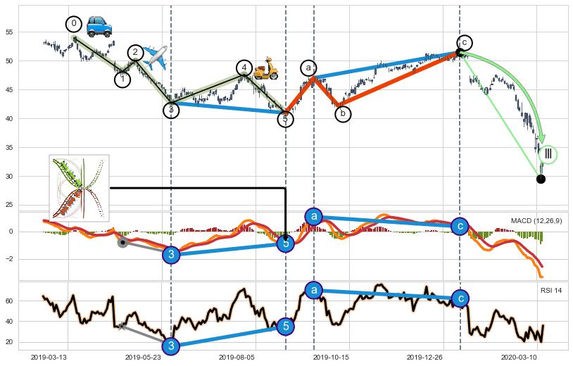 ➣ a, c调整浪端点:【RSI】走势出现【常规背离 & 反转信号】背离程度32.39%,背离夹角角度23.6˚,背离程度中等