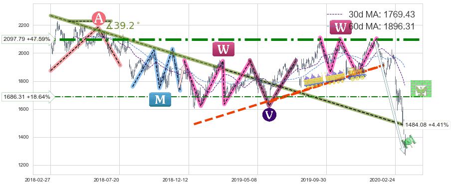 ➢ 【已达成】最小【反转】第一目标价格→(2020-03-09: 1574.35 ), 后续继续【反转】下跌动力衰竭,下跌极小