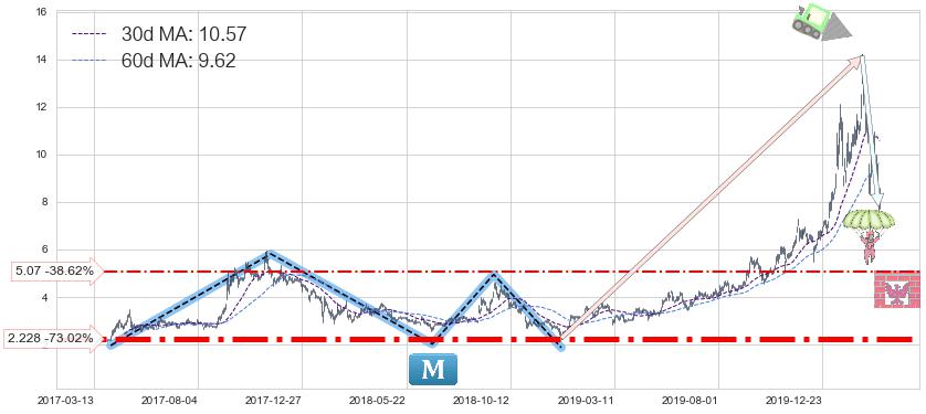 ♘ 支撑价格位2.228,可信任强度95.41%,距离最后交易2020-03-13形成的收盘价格8.26相差 -73.02%