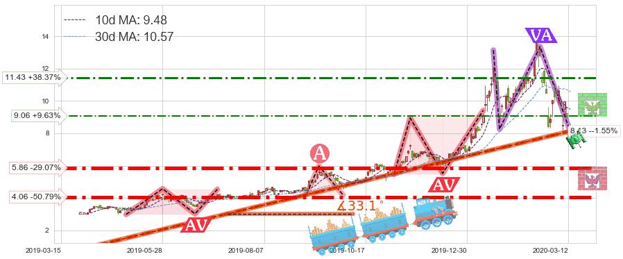 🍖 长线趋势跟踪组合短线均值回复[强支撑信号]2019-03-28-2020-03-11上升趋势依然成立(上涨趋势跟踪依然可行),短线价格略微下行回调(均值回复猜想),即将接近趋势提供的未破位的支撑价格:8.13。