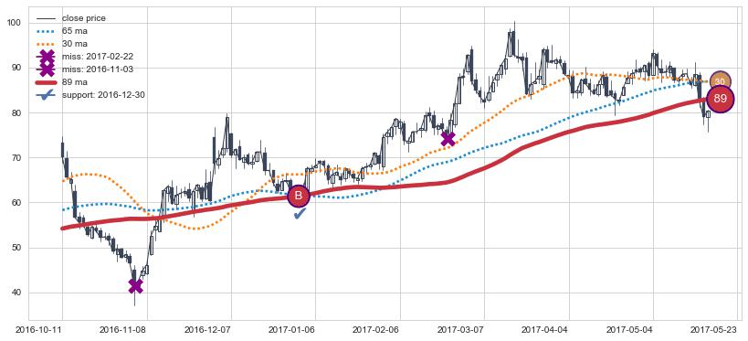 上涨趋势2016-10-11-2017-05-23,均线89确认关键支撑1处