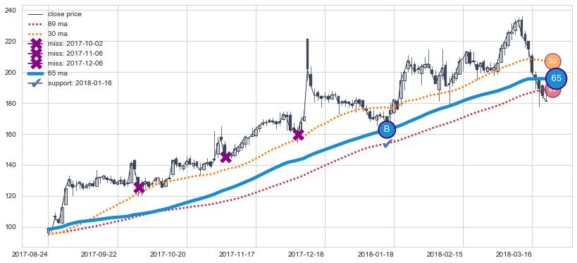 上涨趋势2017-08-24-2018-03-22,均线65确认关键支撑1处