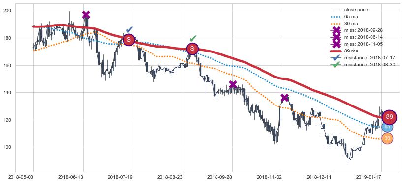 下跌趋势2018-05-08-2019-01-17,均线89确认关键阻力2处