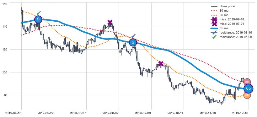 下跌趋势2019-04-16-2019-12-18,均线65确认关键阻力2处