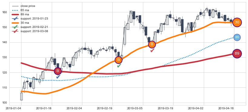 上涨趋势2019-01-04-2019-04-16,均线89, 30确认关键支撑3处