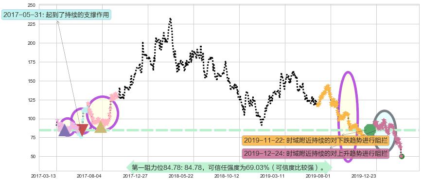 ♞ 第一阻力位84.78价格为84.78,其通过量化计算出的可信任强度为69.03%(可信度比较强)。