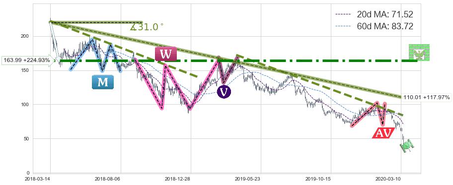 从2018-03-14至2020-03-13,共包含504个交易日,阶段股价下跌-117.33%,阶段股价变动位移路程比: 1 : 11,下跌趋势角度: 31.0