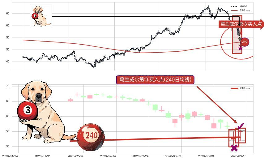 形态多维评估: ⚀ 2020-03-13-日显现 葛兰威尔均线 240日均线 第③买入点 上升趋势的中继信号,后市看涨,买进信号