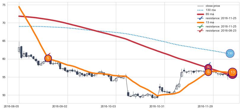 下跌趋势2016-08-05-2016-12-07,均线89, 13确认关键阻力2处