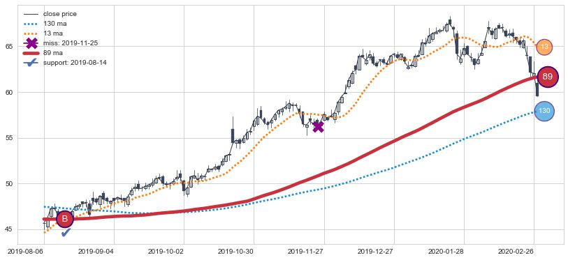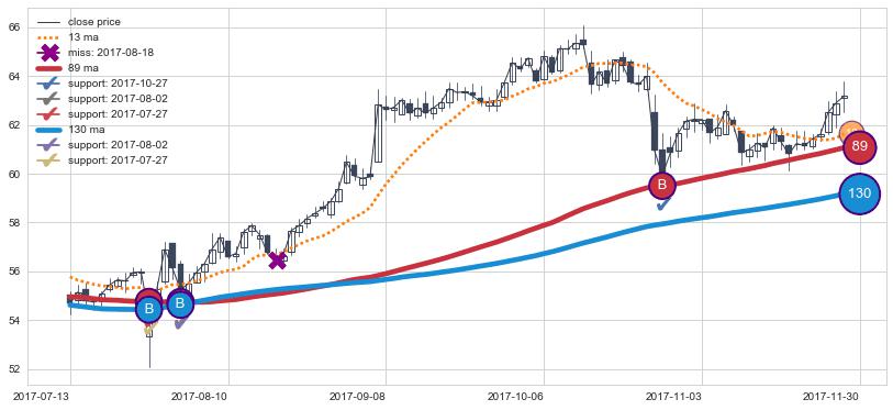 上涨趋势2017-07-13-2017-11-30,均线89, 130确认关键支撑3处