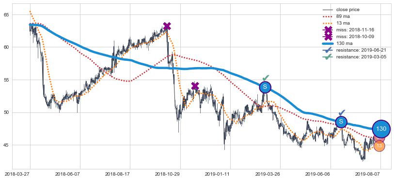 下跌趋势2018-03-27-2019-08-07,均线130确认关键阻力2处