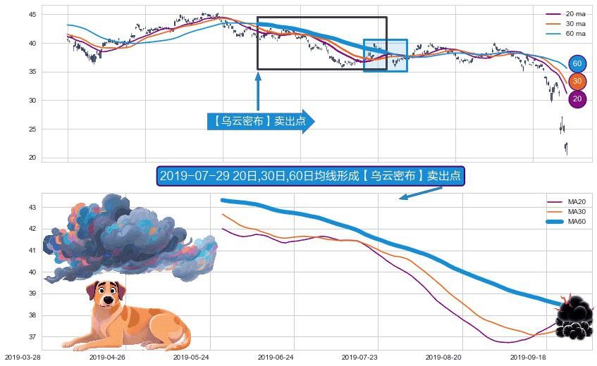 乌云密布是均线组合看空信号,后市看跌,卖出信号,乌云密布与均线粘合形态和上跌途中均线被动修复部分竞合,整体上是空头排列行情中的一段,属于趋势跟踪信号,下跌中继信号,量化止损信号