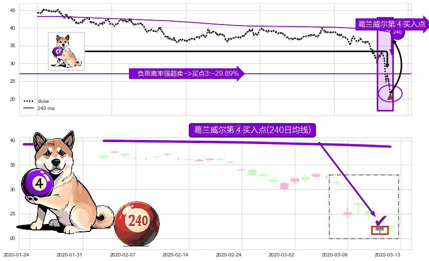 形态多维评估: ⚀ 2020-03-12-日显现 葛兰威尔均线 240日均线 第④买入点 下降趋势均值回复的短线反弹信号,后市看涨,买进信号