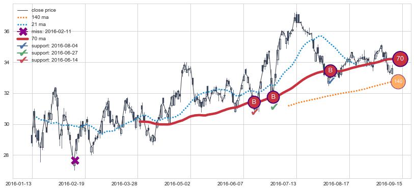 上涨趋势2016-01-13-2016-09-15,均线70确认关键支撑3处