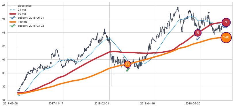 上涨趋势2017-09-08-2018-07-30,均线140, 70确认关键支撑2处