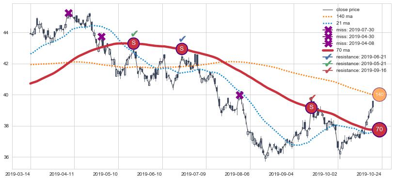 下跌趋势2019-03-14-2019-10-24,均线70确认关键阻力3处