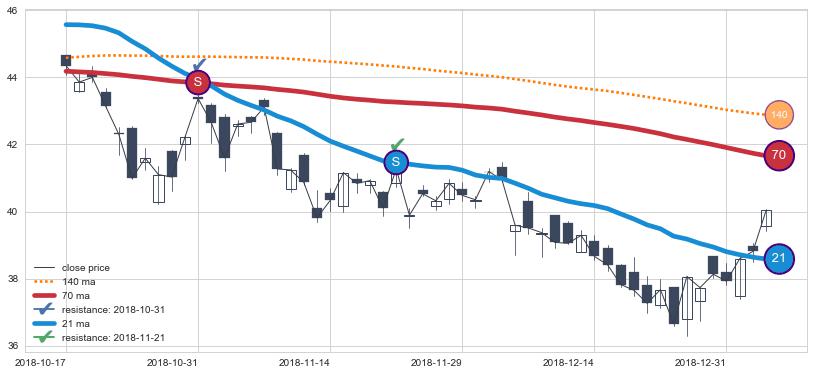 下跌趋势2018-10-17-2019-01-04,均线21, 70确认关键阻力2处
