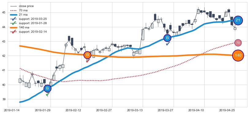 上涨趋势2019-01-14-2019-04-25,均线140, 21确认关键支撑3处