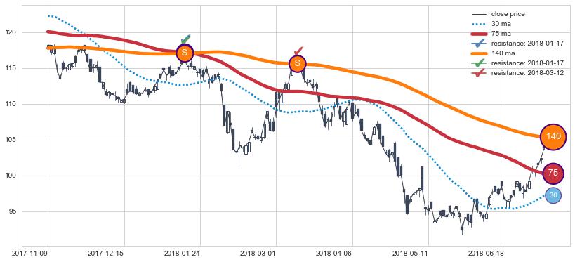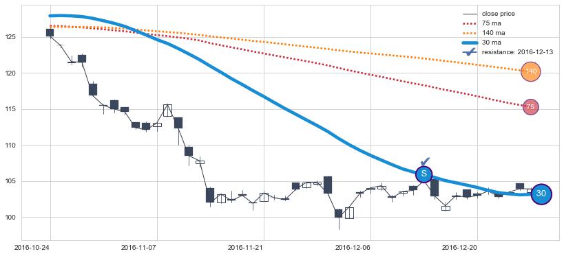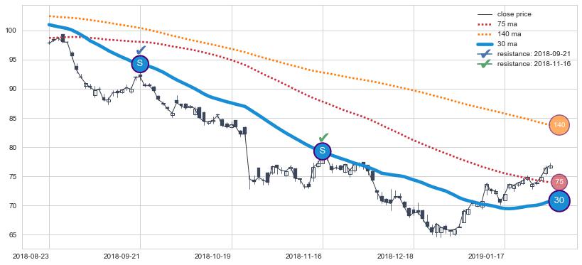 下跌趋势2017-11-09-2018-07-06,均线75, 140确认关键阻力2处