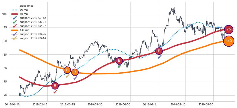 上涨趋势2019-01-10-2019-10-04,均线75, 140确认关键支撑5处