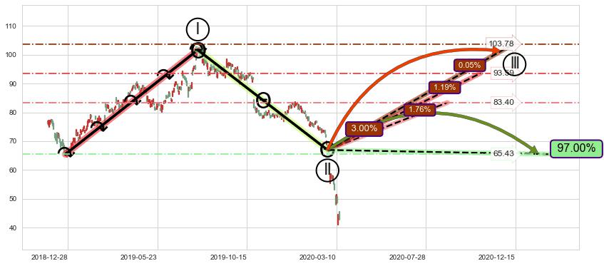 ➣ 循环浪继续向上【平均值】位置(2020-10-21, 93.59),匹配聚类样本比例39.60%, 可能性概率1.19%