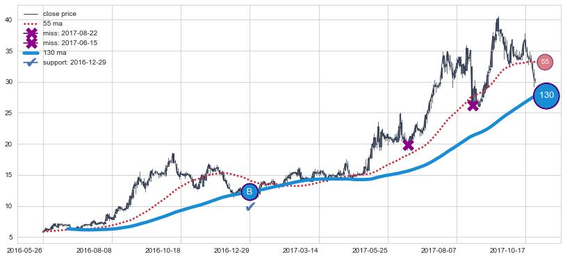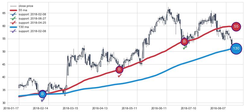 上涨趋势2018-01-17-2018-08-13,均线130, 55确认关键支撑3处