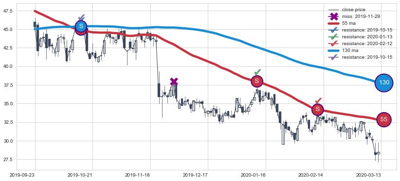 下跌趋势2019-09-23-2020-03-13,均线130, 55确认关键阻力3处
