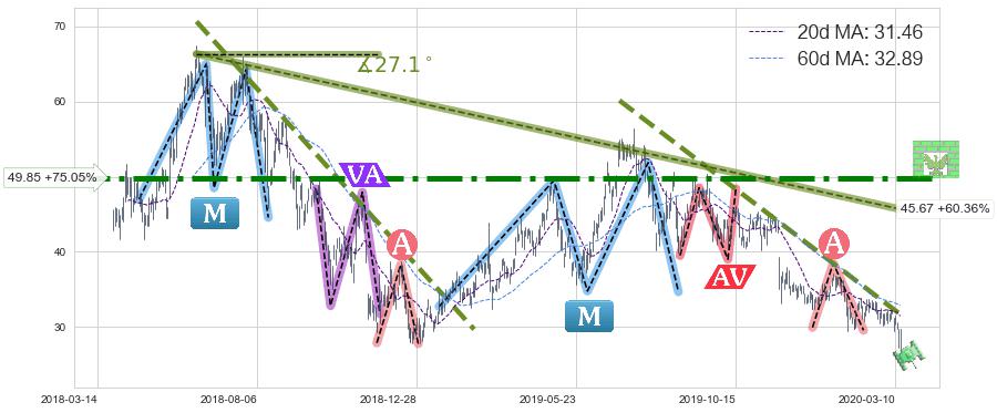 ➢ 【已达成】最小【整理】第一目标价格→(2020-03-12: 28.17 ), 后续继续【整理】下跌动力依然存在,下跌空间适中