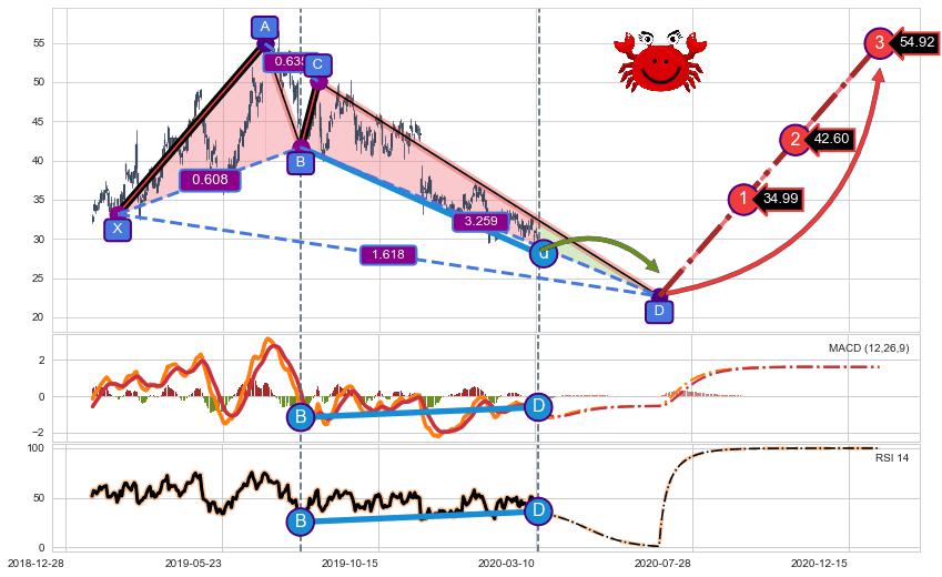 ➢ 距离预测D点位置尚有下跌空间,短线依然【看跌】, 耐心等待看涨【螃蟹】形态反转启动
