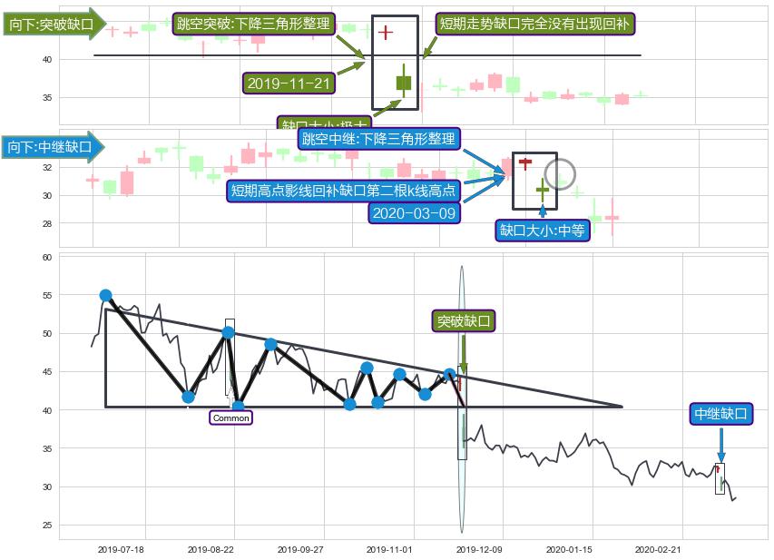➣ 普通缺口在【下降三角形整理】震荡整理形态中出现