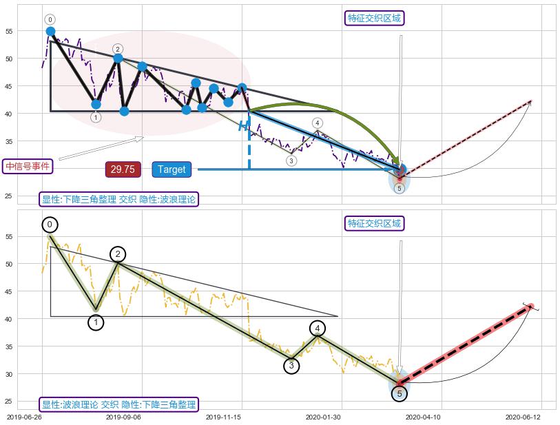 ➢ 【多方力量耗尽,空方打破攻守平衡点】下降三角形中继整理, 已在2019-11-21突破【支撑】颈线 40.40 →演变成下降通道