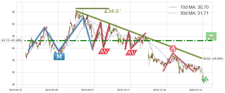 ➢ 【已达成】最小【整理】第一目标价格→(2020-03-12: 29.75 ), 后续继续【整理】下跌动力依然存在,下跌空间适中