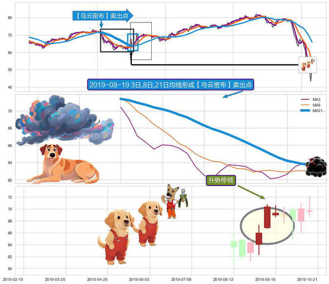 ➣ 2019-08-01日-2019-09-04日显现 3日-8日-21日均线 【乌云密布】卖出点 看空信号,后市看跌,卖出