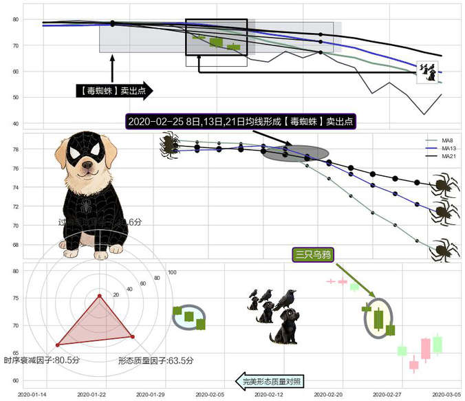 ➣ 三只乌鸦 + 【毒蜘蛛】卖出点毒蜘蛛均线交叉卖出点信号叠加后【目标达成率】极高,【看空】信号叠加【存续影响极小】