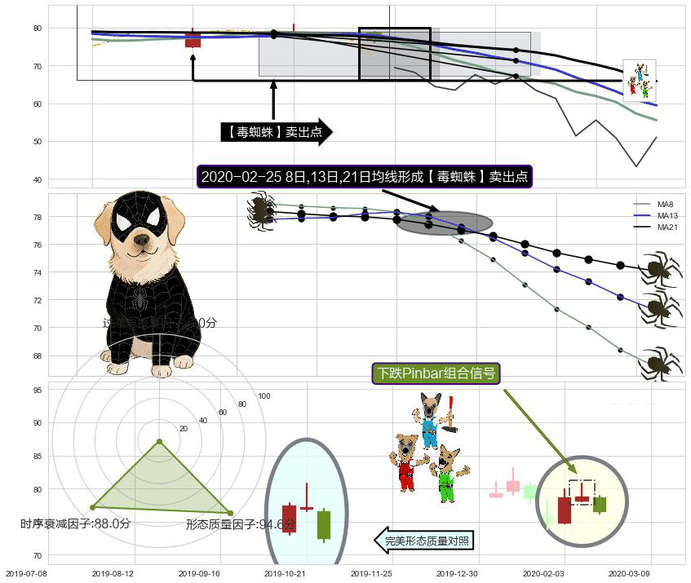 ➢ 下跌Pinbar组合信号 + 【毒蜘蛛】卖出点毒蜘蛛均线交叉卖出点信号叠加后【反向回撤率】中等,【看空】信号叠加【存续影响中等】