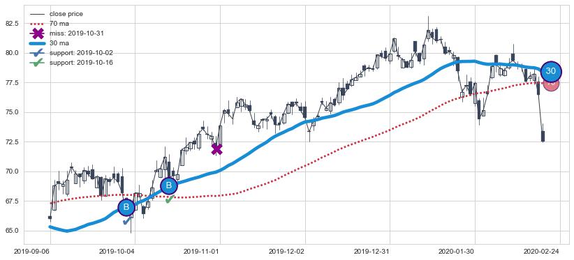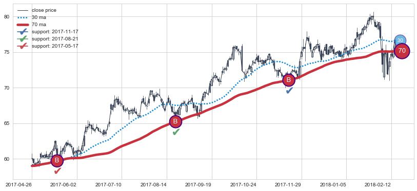 上涨趋势2017-04-26-2018-02-14,均线70确认关键支撑3处
