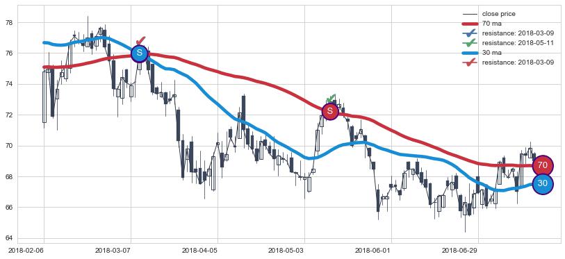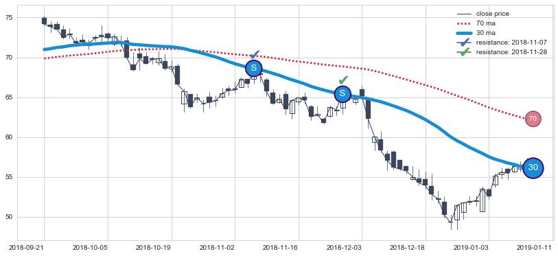 下跌趋势2018-02-06-2018-07-19,均线70, 30确认关键阻力2处