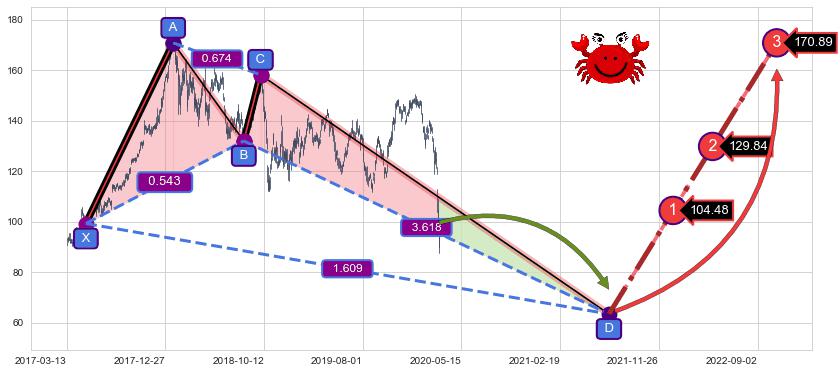 ➣ 未完成【螃蟹】形态起点X: 2017-05-09, 已到达C点: 2018-10-03, 预测最终D点: 2021-07-08, 共1060交易日