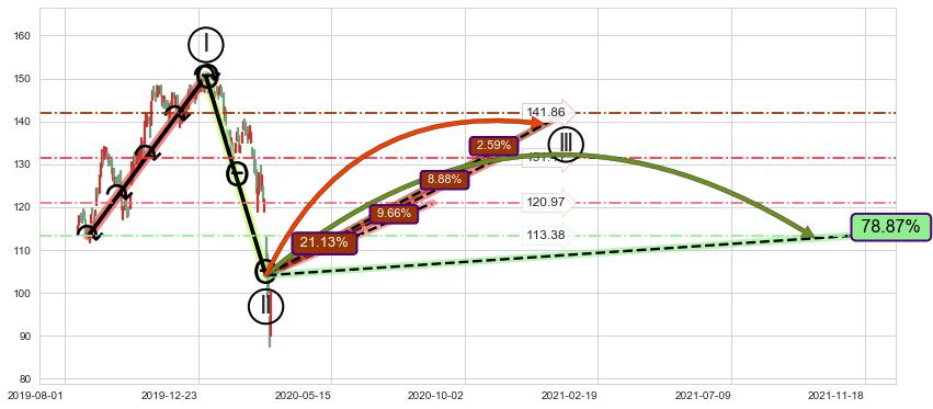➣ 循环浪继续向上【平均值】位置(2020-11-09, 131.41),匹配聚类样本比例42.02%, 可能性概率8.88%