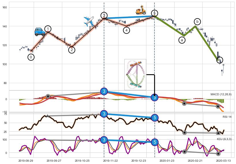 ➢ 1,3,5驱动浪MACD, RSI, KDJ走势都出现【常规背离】反转信号增强