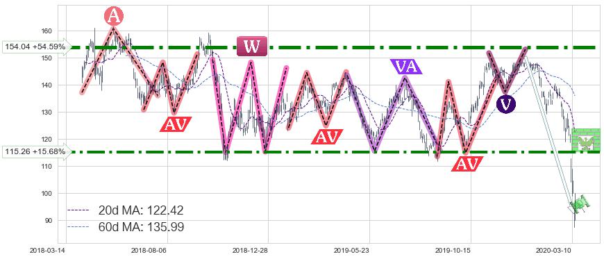 ♘ 阻力价格位154.04,可信任强度89.81%,距离最后交易2020-03-13形成的收盘价格99.64相差 +54.59%