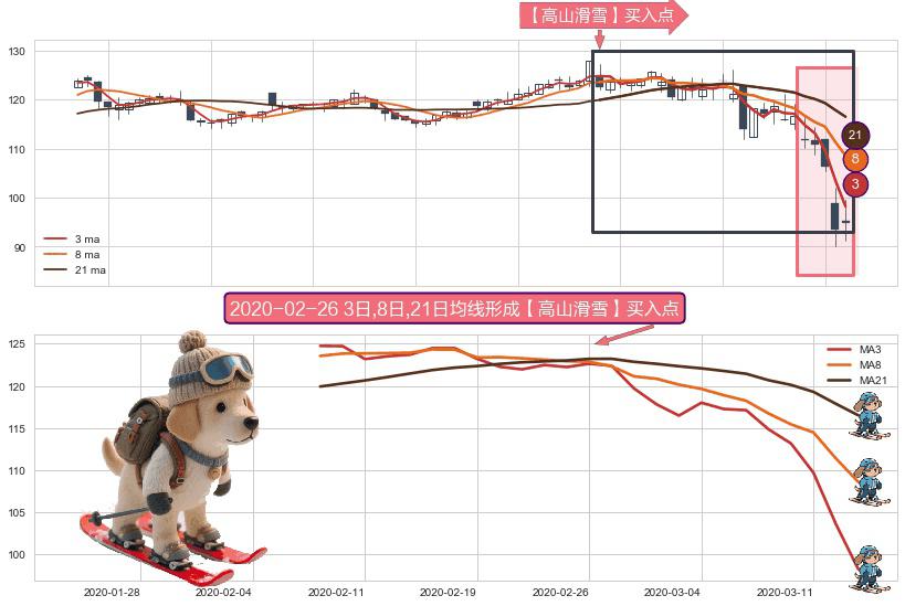 ⚀ 2020-02-07日-2020-03-13日显现 3日-8日-21日均线 【高山滑雪】买入点 看多信号,后市看涨,买入