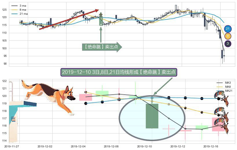 ⚀ 2019-12-10日显现 3日-8日-21日均线 【绝命跳】卖出点 看空信号,后市看跌,卖出