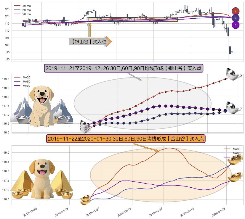 ⚀ 2019-11-25-日至2020-01-30-日显现 30日-60日-90日均线 【金山谷】买入点 其再次确认了买入信号,可靠性更强,买入