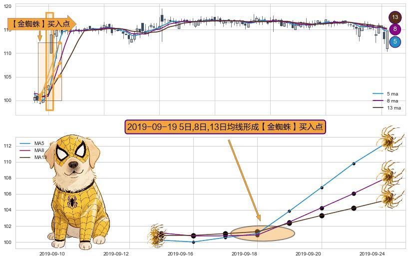 ⚀ 2019-09-19日显现 5日-8日-13日均线 【金蜘蛛】买入点 看多信号,后市看涨,买入