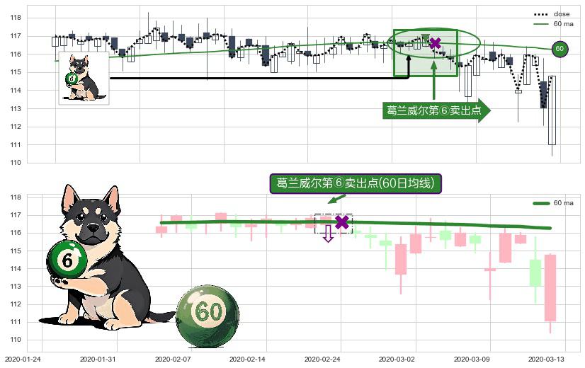 ⚀ 2020-02-21-日显现 葛兰威尔均线 60日均线 第⑥卖出点 走势反转见顶信号,后市看跌,卖出信号
