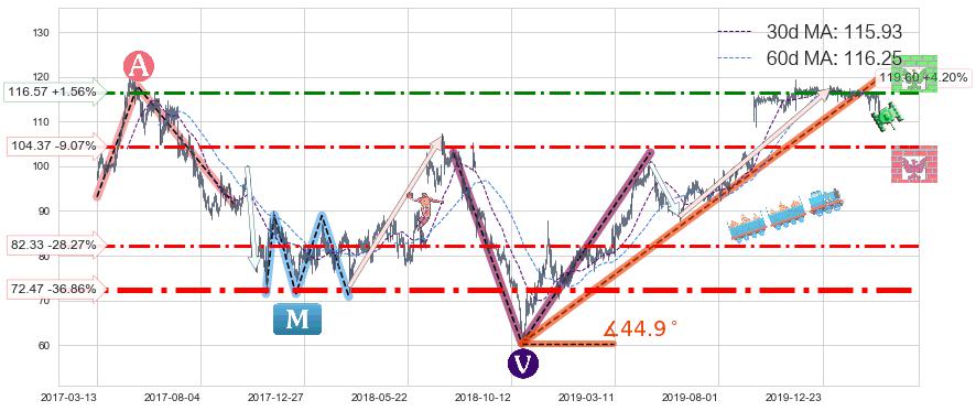 ♘ 阻力价格位116.57,可信任强度69.24%,距离最后交易2020-03-13形成的收盘价格114.78相差 +1.56%