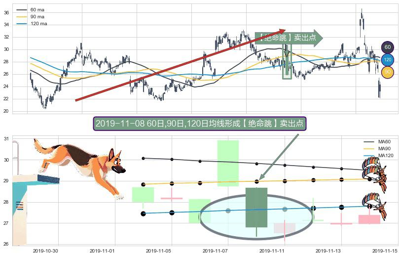 ⚀ 2019-11-08日显现 60日-90日-120日均线 【绝命跳】卖出点 看空信号,后市看跌,卖出